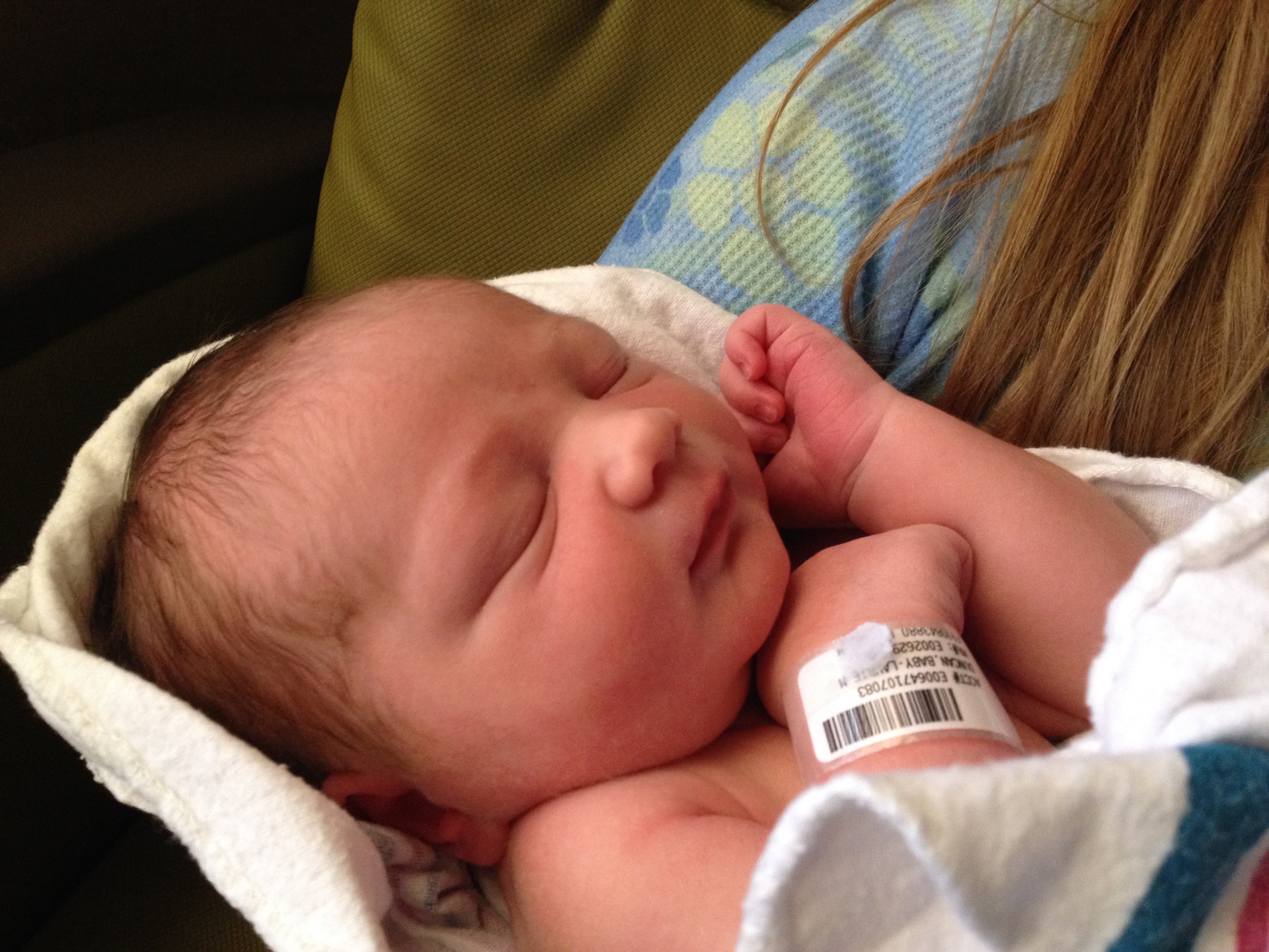 When we arrived at OU, however, all the delivery rooms were full or dirty so I was put in a triage room until a room was made ready. I’m not sure the staff originally believed I was in true labor – I tend to be quiet when I’m in pain, and that’s not a lot of help when needing hospital staff to pay attention. After getting into a gown my water broke, but I was already on a bed pad and it all soaked in, so the midwife just had to take my word for it. She asked if I wanted to be checked and I said yes. I was dilated to a 5, so they let me stay. I tried to tell them how quickly my last labor had gone, but the monitors weren’t picking up much activity because I was lying on my side. This time was also different for me because there were such different intervals between my contractions. Sometimes they were every two minutes, and then I’d go for seven minutes before another came. But, they were getting stronger, and pretty soon I was really hurting. I really depended a lot on my husband to help keep my breathing under control. He also kept trying to push the staff to get a room ready – one reason we chose this place was because they had rooms designed with amenities like laboring tubs, birthing balls and other things most hospitals don’t have. The problem was no one seemed all that convinced that my labor was progressing as fast as I knew it was. After having checked me the first time, the midwife had said she would see me in the delivery room, but no one was working very hard to get me there. And no one was coming to check on me unless we called for them. Finally, when I knew it getting close, my husband was able to get the attention of a nurse who checked me and realized it was time – though really, the time to move me had passed. As I was being wheeled through the halls to the delivery room, my body was already pushing the baby out. I only ended up in the delivery room for about 10 minutes when our 7 pound, 15 ounce son was born! From my very first contraction to his birth was only 4.5 hours, and I was only at the hospital for 2.5- 3 hours before he came.